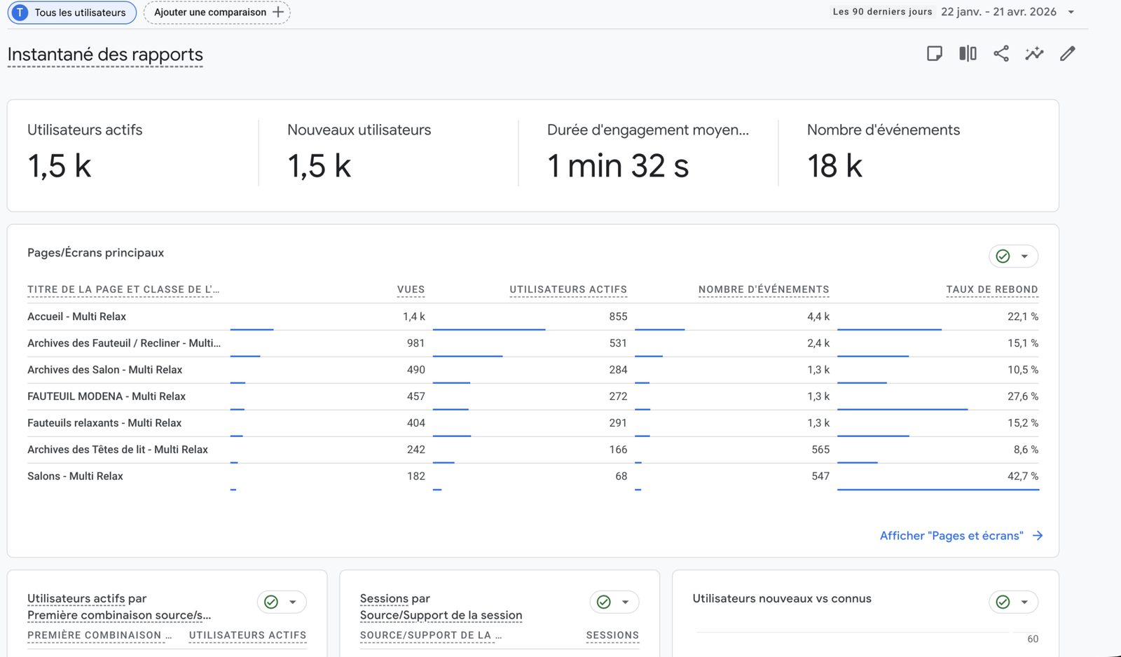 Multi Relax avait besoin d’une stratégie digitale complète pour développer sa visibilité en ligne et générer des ventes sur 4 villes du Maroc. J’ai développé le site e-commerce, mis en place la stratégie SEO, géré le compte Instagram et configuré Google Analytics 4 pour mesurer chaque action. Résultat : 1 500 utilisateurs actifs générés organiquement en 90 jours.