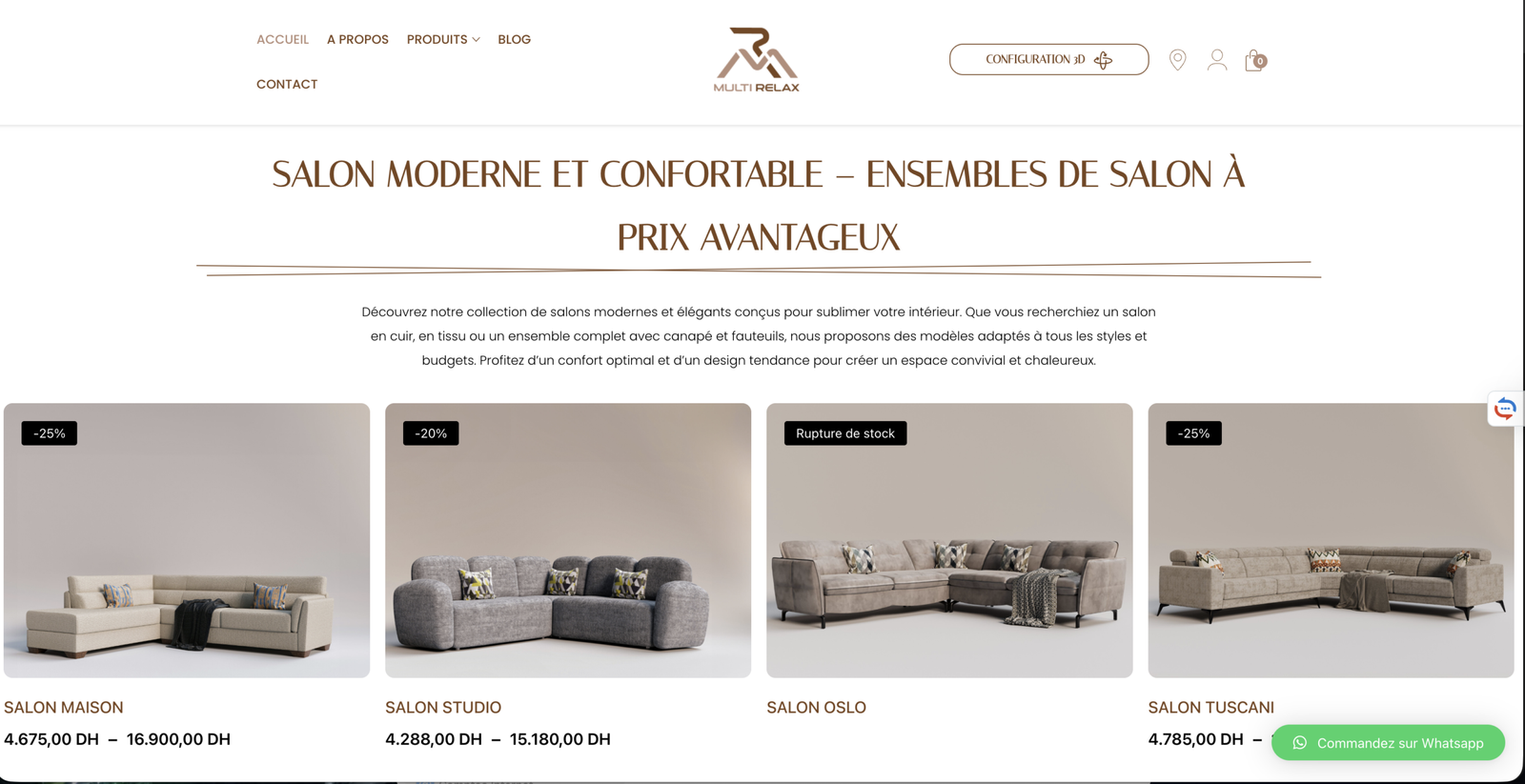 Développement et optimisation de la présence digitale complète de Multi Relax, marque marocaine spécialisée dans les fauteuils recliner, salons et mobilier haut de gamme. Le projet couvre le développement du site e-commerce WooCommerce avec configurateur 3D, la stratégie SEO organique, la gestion du contenu Instagram et la mise en place de Google Analytics 4 pour le suivi des performances.